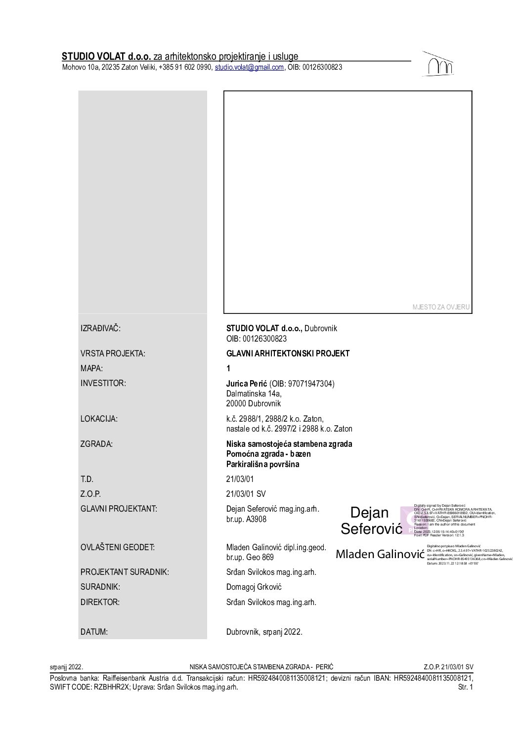 Prodaje se građevinsko zemljište ukupne površine cca 796 m2 (čest. 29881 i 29882, obje k.o. Zaton), s glavnim arhitektonskim projektom za nisku samostojeću stambenu zgradu s bazenom i dva parkirna mjesta, smješteno u naselju Zaton, sjeverno od Grada Dubrovnika. Parcela se nalazi unutar izgrađenog građevinskog područja naselja u zoni mješovite pretežito stambene namjene M1, pri čemu je kuća pozicionirana u središnjem dijelu čestice i orijentirana prema jugozapadu, s otvorenim pogledom na cijelu uvalu Zaton.